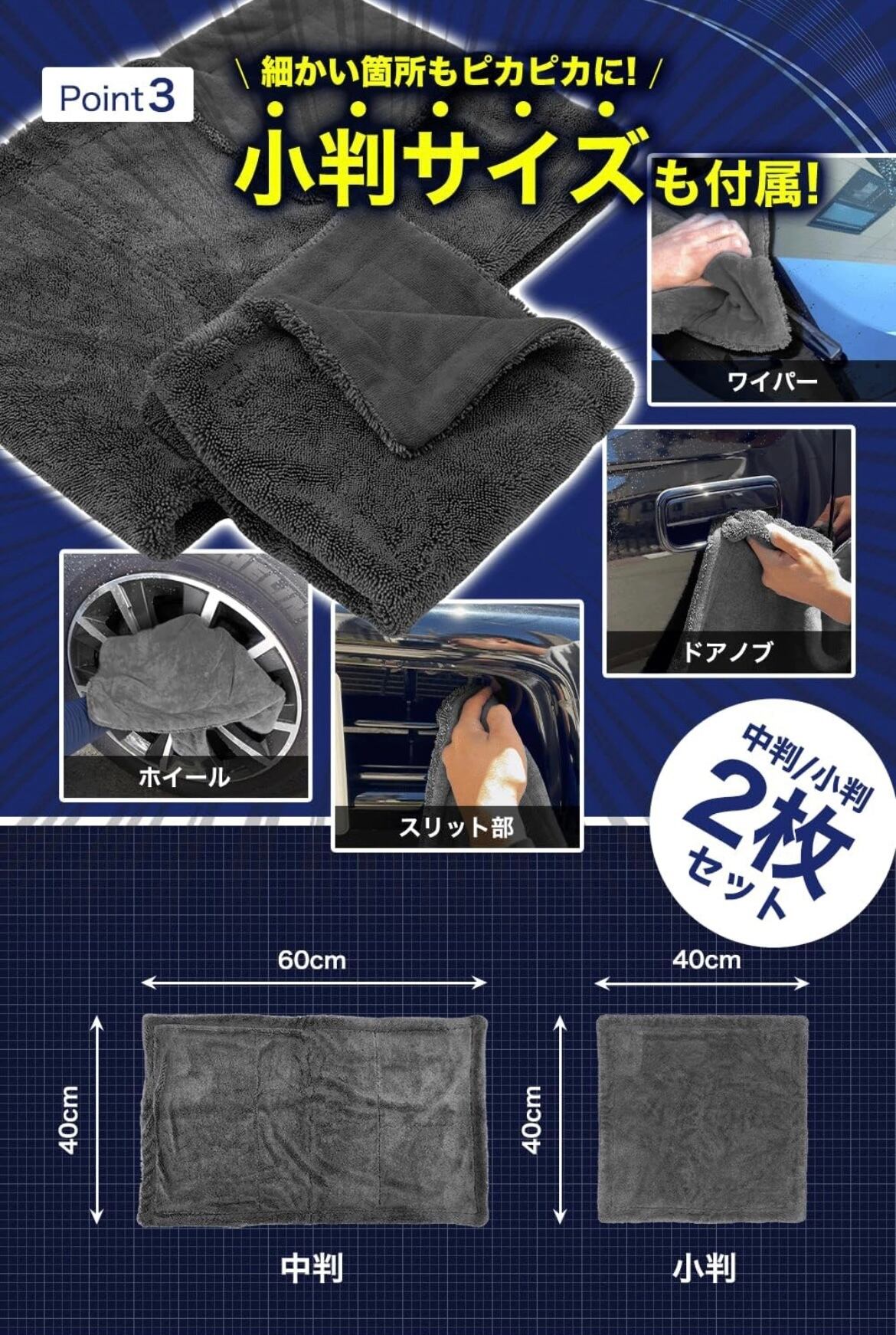 ■小判サイズ40cm×40cmもセットになっているので、ホイールやウィンドウバイザー内部などの細部を拭くことも可能なセットです。