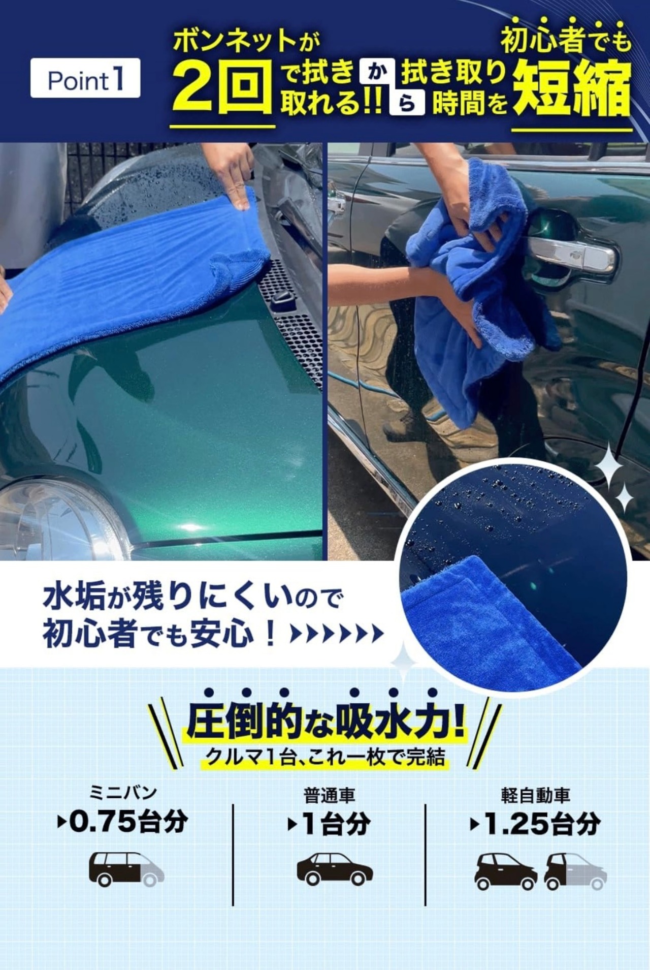 ■大型車で約0.75台、中型車で約1台、小型車で約1.25台も拭きあげが可能な『吸水量』を誇ります!