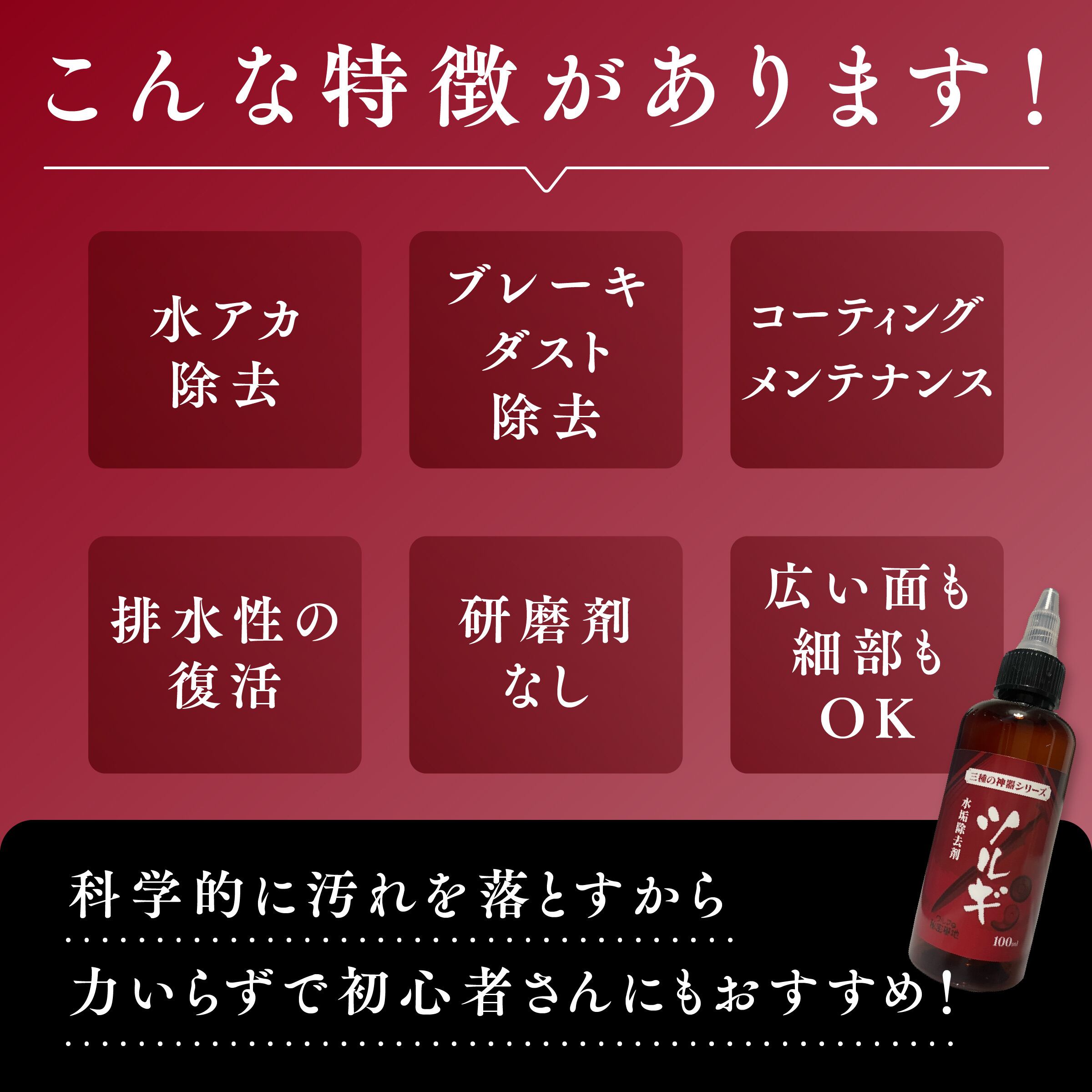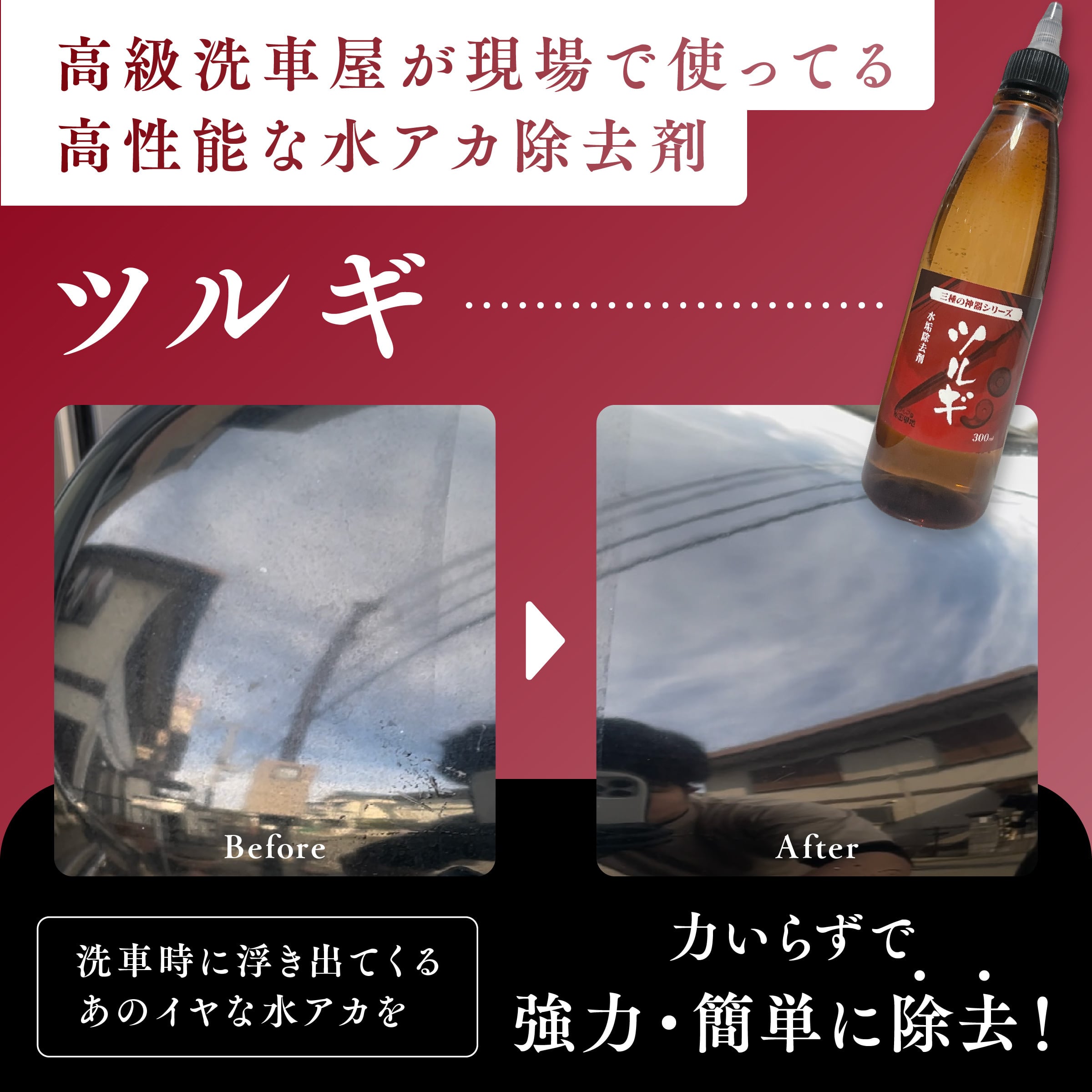 当店でもシリーズ化しておりますが、”三種の神器”という、鉄粉除去/水垢除去/油脂汚れ除去、という下地処理の鉄則の3つの内、水垢除去に当たるのがこのツルギとなります。