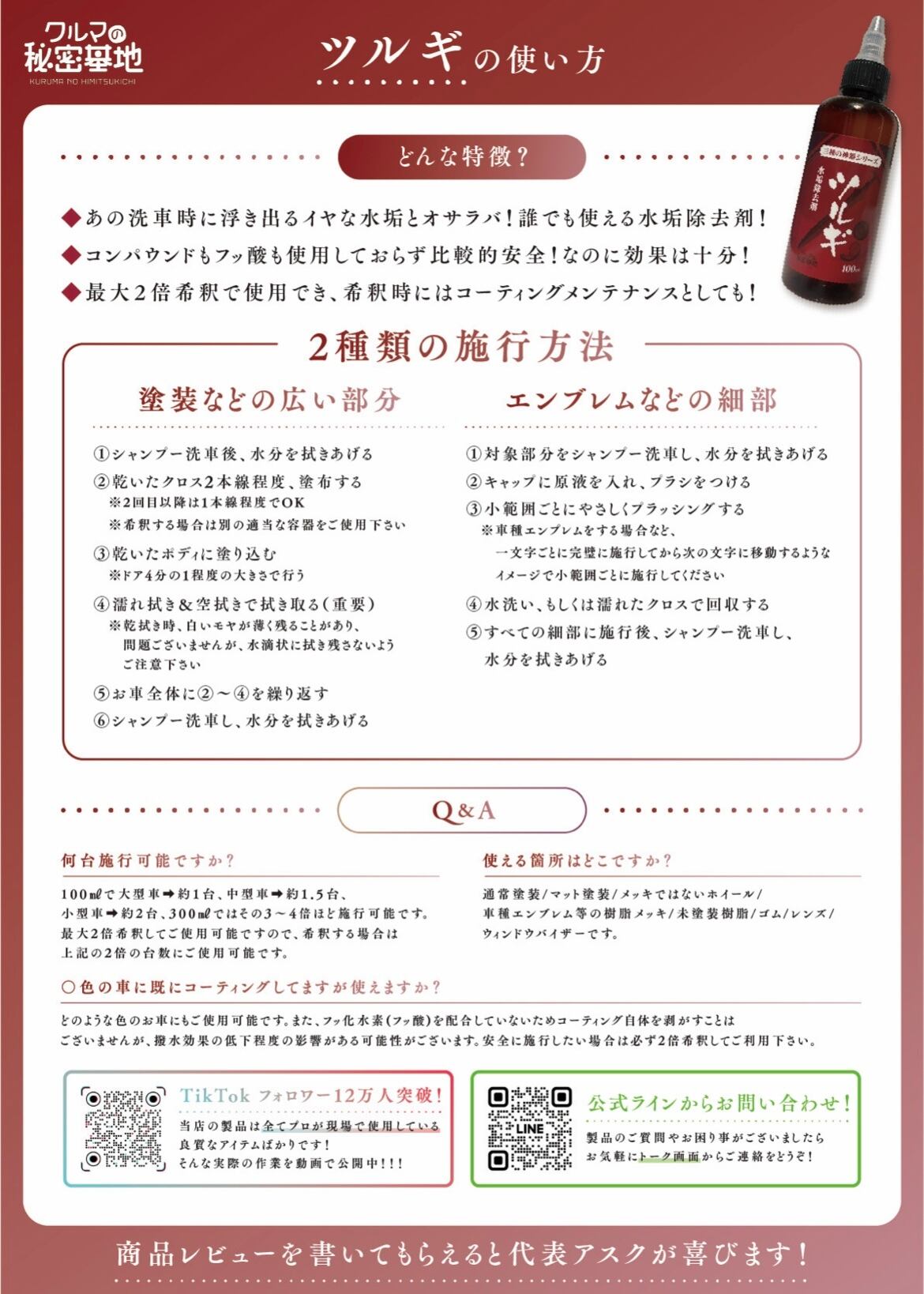 ■同じく水垢除去ができる当店の『カガミ』との違いは、ツルギには研磨剤が一切含まれていないため”コーティングへの安全性”が大きく違う点です。