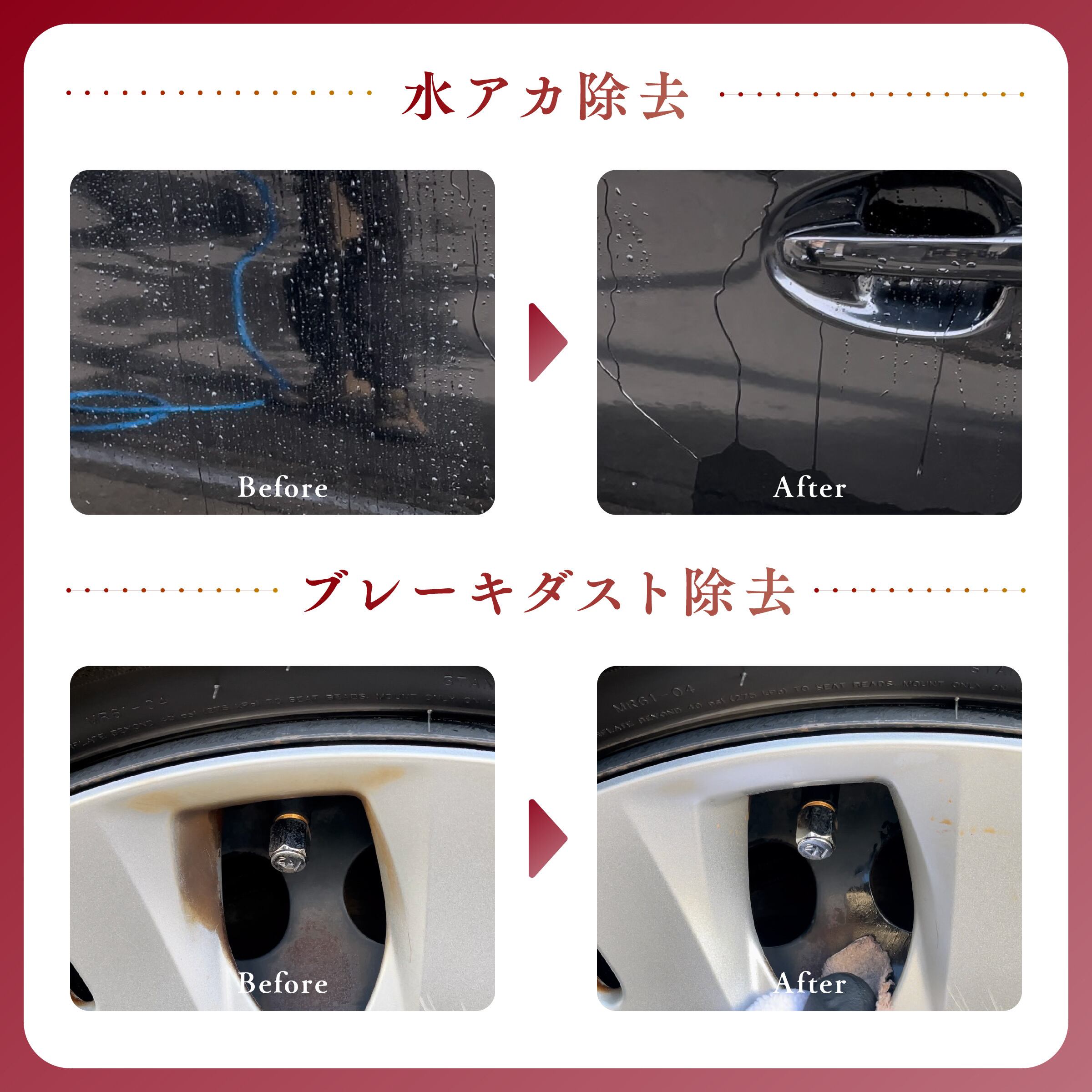 ■フッ酸を使用していないため、コーティングや塗装、意図せず付着してしまったメッキやガラスに対するダメージ性が少ないため比較的安全性が高く、さらにコーティングメンテナンスとしてもご使用可能!